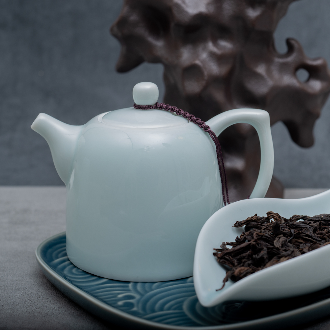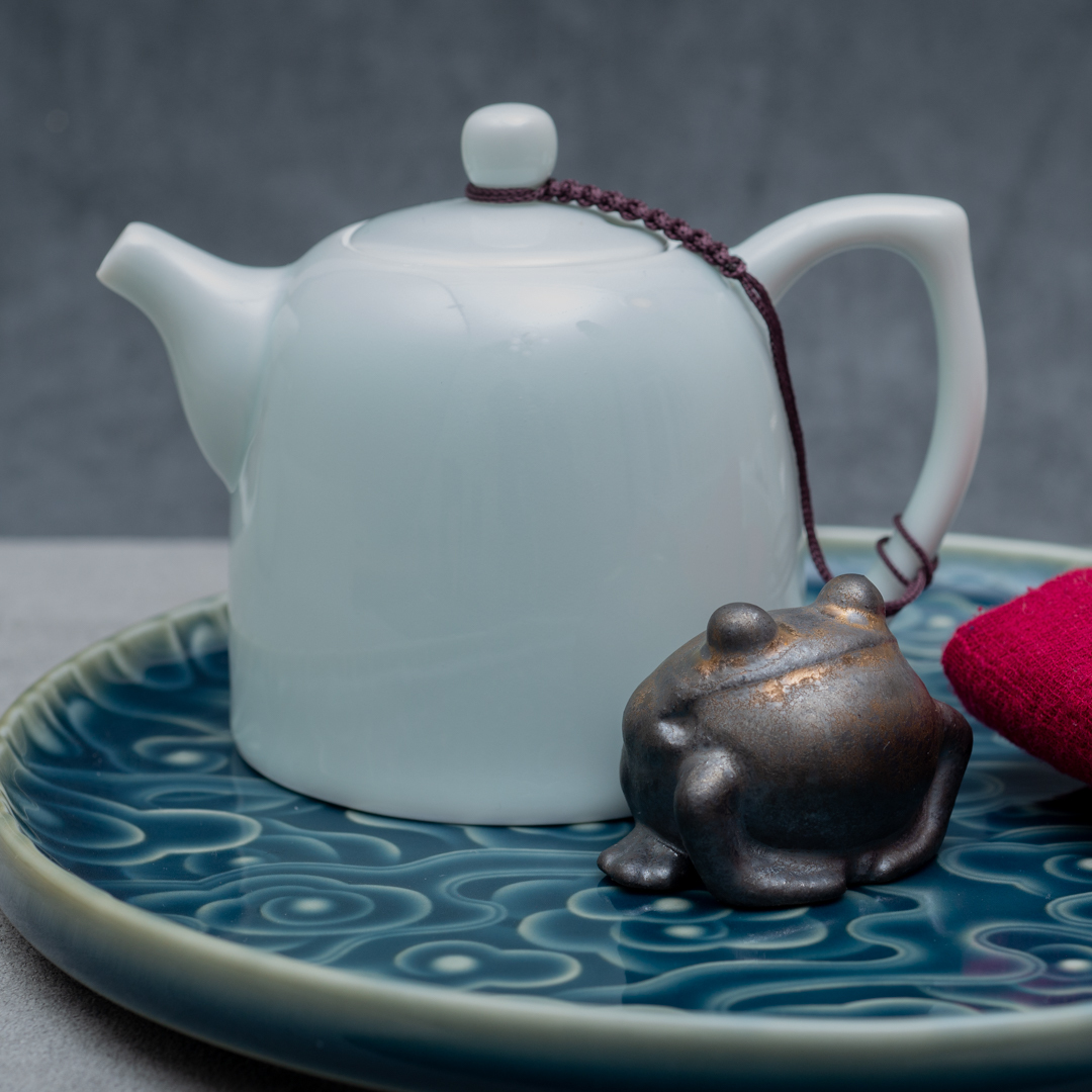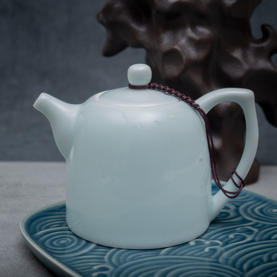 Фарфоровый заварочный чайник покрытый голубоватой глазурью.